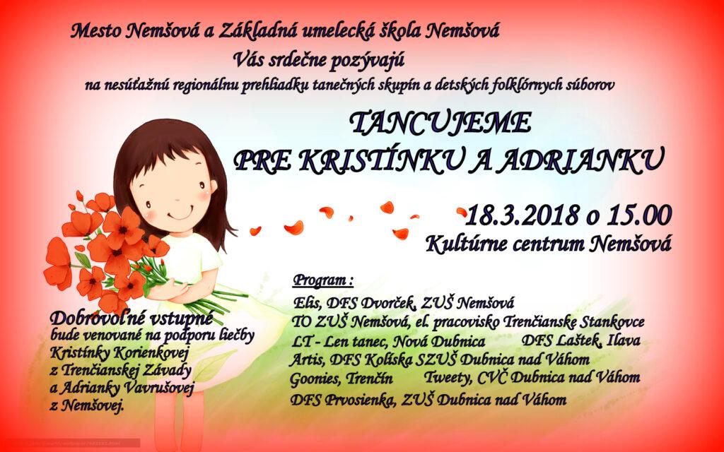 Mesto Nemšová a ZUŠ Nemšová Vás srdečne pozývajú na nesúťažnú regionálnu prehliadku tanečných skupín a detských folklórnych súborov TANCUJEME PRE KRISTÍNKU A ADRIANKU. Zaplatením dobrovoľného vstupného môžete podporiť Kristínkinu a Adriankinu liečbu. Zároveň môžete priniesť vrchnáčiky z PET fliaš pre Kristínku Korienkovú.