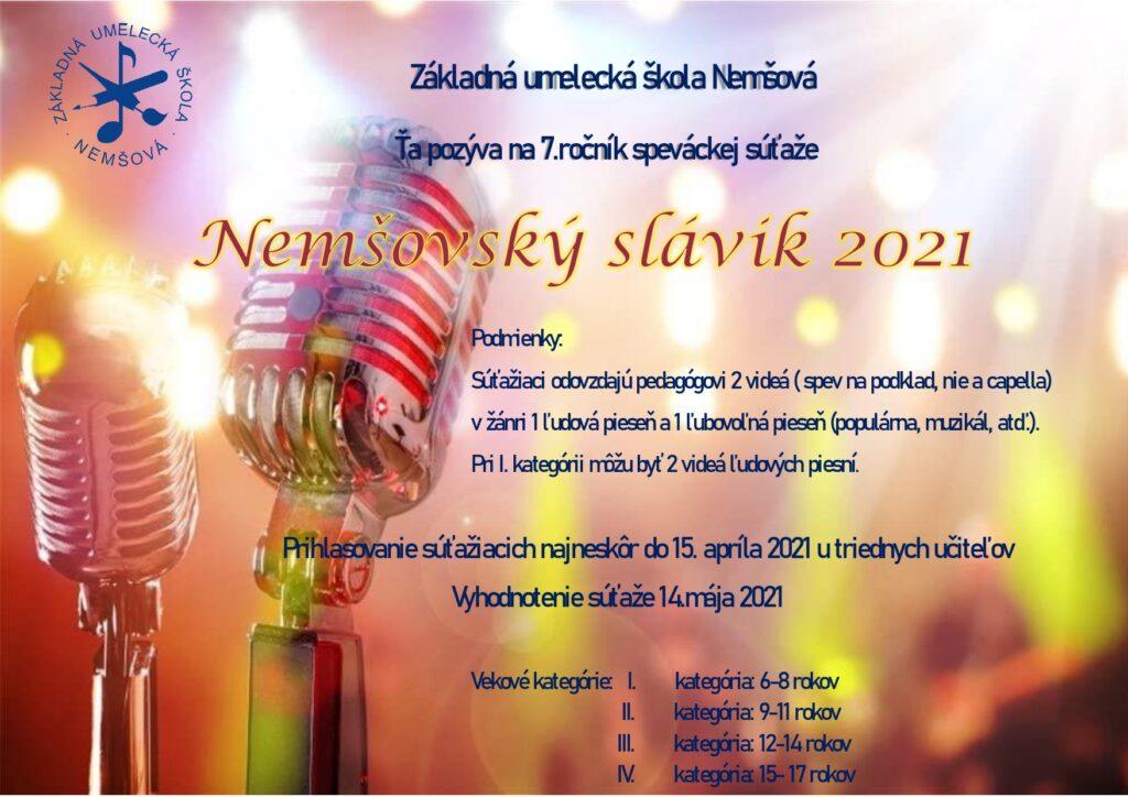 Napriek epidemiologickej situácii, kedy nemôžeme vyučovať spev prezenčnou formou sa naši žiaci poctivo pripravovali a so svojimi pedagógmi komunikovali počas online stretnutí. Preto sme sa rozhodli, že aj v tomto školskom roku sa uskutoční spevácka súťaž Nemšovský slávik. Avšak prvýkrát má podobu internej súťaže. Zúčastnilo sa jej 17 žiakov, ktorí súťažili v štyroch vekových kategóriách. Súťažiaci sa predstavili s jednou ľudovou piesňou a s piesňou podľa vlastného výberu.