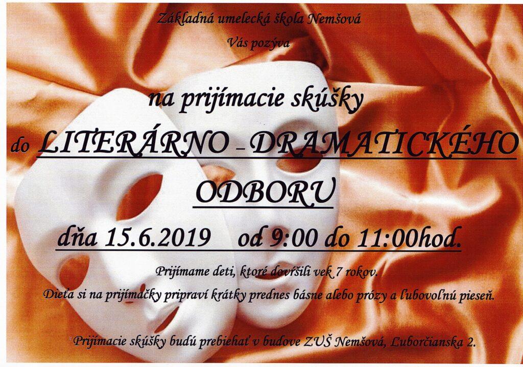 Naša škola otvára v školskom roku 2019/2020 literárno-dramatický odbor. Preto pozývame všetky deti od 7 rokov, najmä tie, ktoré sa nehanbia na prijímacie skúšky.