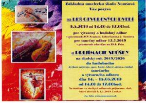 Zároveň Vás pozývame aj na prijímacie skúšky do hudobného, výtvarného alebo tanečného odboru, ktoré sa uskutočnia v dňoch 14. a 15.5.2019 v priestoroch našej školy.