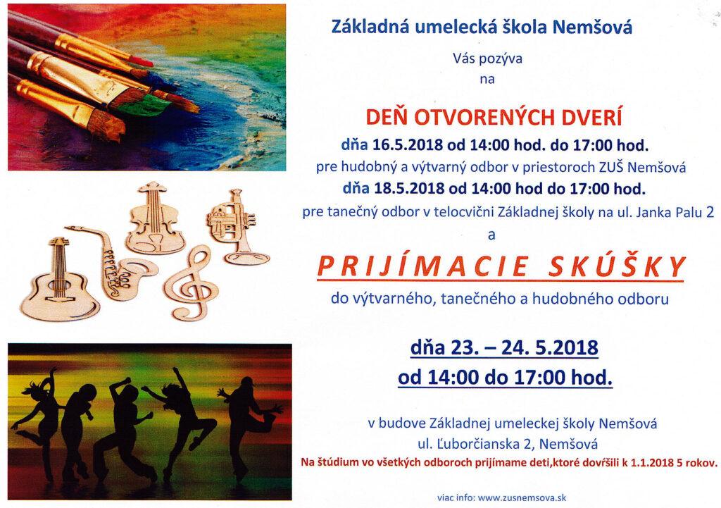 Dňa 16.5.2018 (streda) od 14:00 – 17:00 hod. Vás srdečne  pozývame na Deň otvorených dverí. Môžete si pozrieť priestory našej školy a vyučovanie vo výtvarnom a hudobnom odbore.  Vyučovanie tanečného odboru prebieha v telocvični Základnej školy na ul. Janka Palu 2, Deň otvorených dverí pre tento odbor bude 18.5.2018 od 14:00 – 17:00 hod. v telocvični ZŠ.