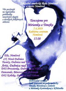 Pozývame Vás podporiť dobrú vec. Príďte si pozrieť regionálnu prehliadku tanečných skupín a detských folklórnych súborov, prispejte dobrovoľným vstupným a pomôžte tak Miriamke a Timejke.